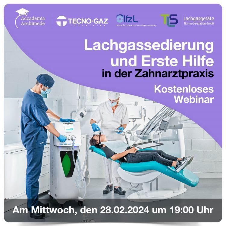 Informieren Sie sich am Mittwoch, 28.02.2024 um 19:00 Uhr in unserem kostenlosen Webinar über die Integration der Lachgassedierung in der Zahnarztpraxis. • Warum Lachgas in der Zahnheilkunde? • Wirkung des Lachgases • Lachgassedierung: Für wen und wann? • Verschiedene Formen der Lachgassedierung im Vergleich • Historie des Lachgases • Patientenselektion • Kontraindikationen und Wechselwirkungen • Gerätekunde Anschließend werden die Bedeutung einer Erste-Hilfe Ausstattung und Ausbildung in der Zahnarztpraxis erläutert.